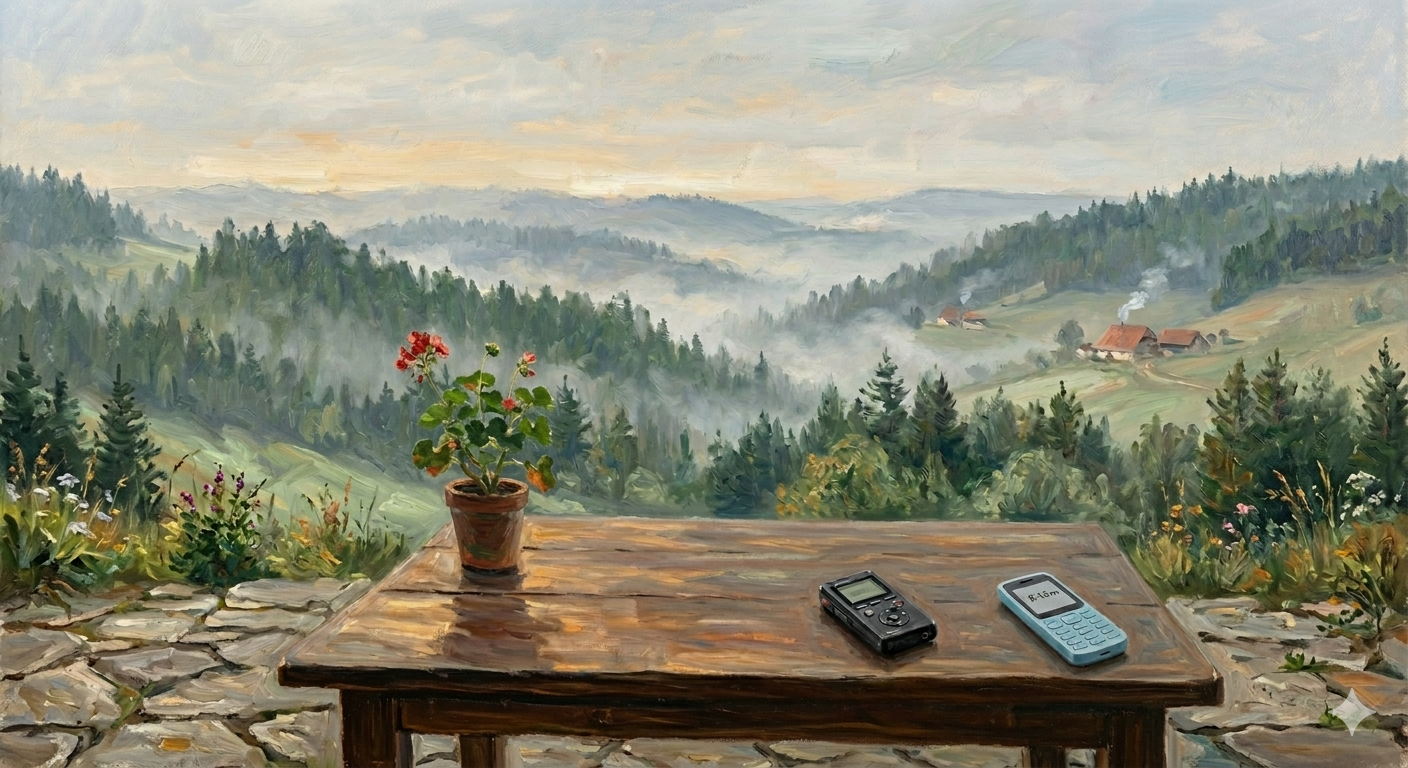 Und genau hier schließt sich der Kreis. Denn dieses Denken entsteht nicht am Bildschirm. Es entsteht auf dem Weg zur Arbeit, beim Spaziergang, in den Momenten, in denen nichts dazwischenfunkt. Ich spreche manchmal minutenlang ins Diktiergerät — ganze Gedankenstränge, die sich erst beim Aussprechen ordnen. Die KI macht sie lesbar. Aber der Raum, in dem sie entstehen, den schafft das Weglassen des Smartphones; ja eigentlich die ausgehaltene Langeweile.
